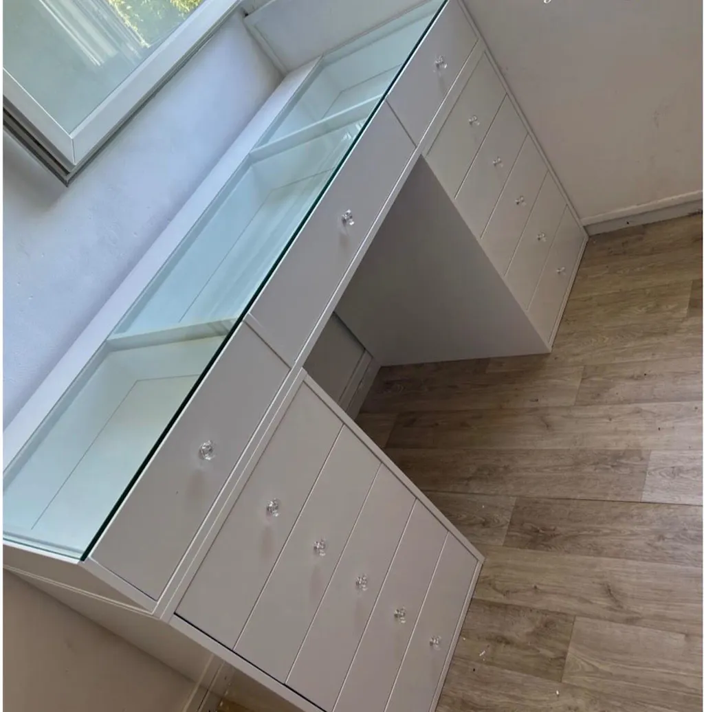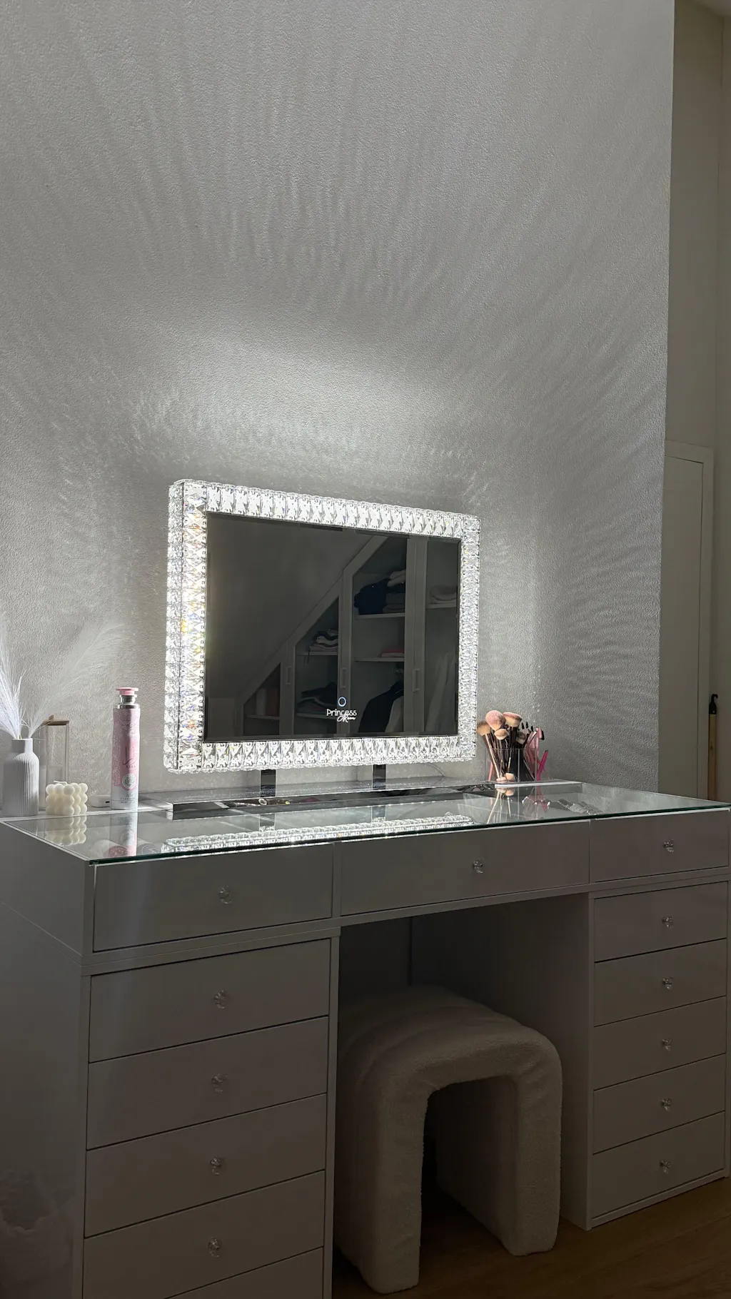 La Princess Vanity remet tout en place. 13 tiroirs profonds pour ranger sans tasser. 3 tiroirs avec plateau en verre pour garder l’essentiel visible, propre, prêt. Bois premium et verre trempé, avec un revêtement anti rayures pour rester net au quotidien.