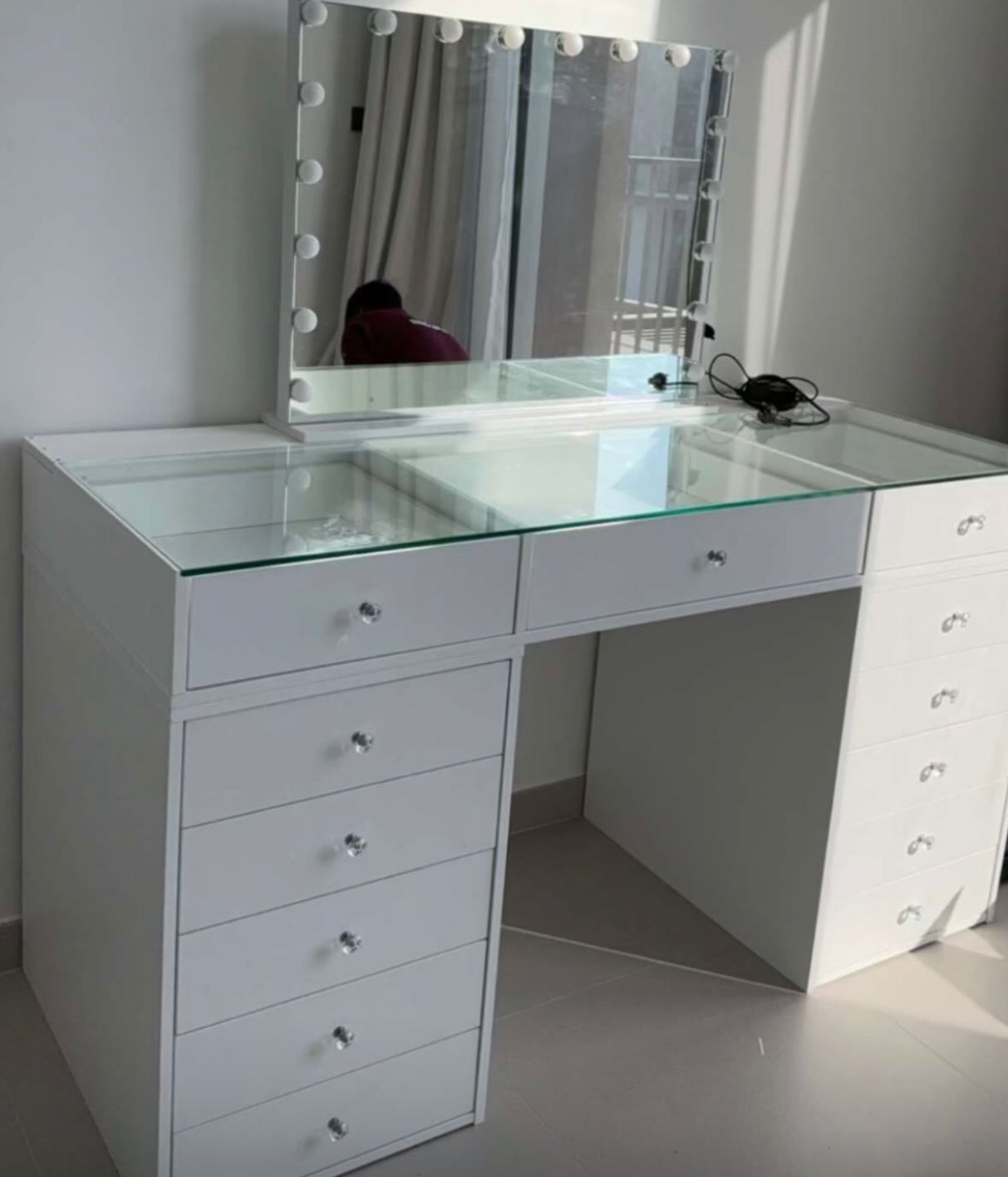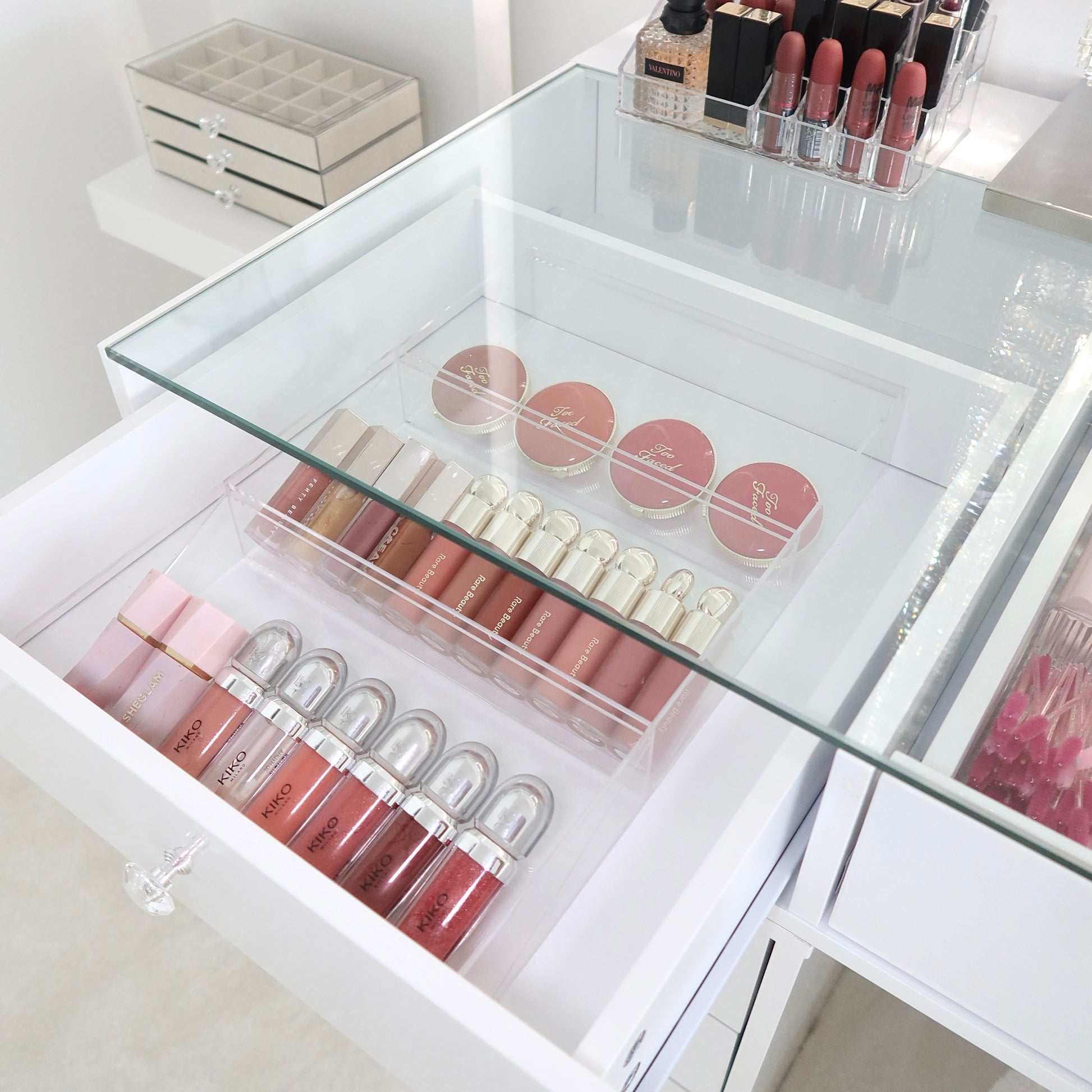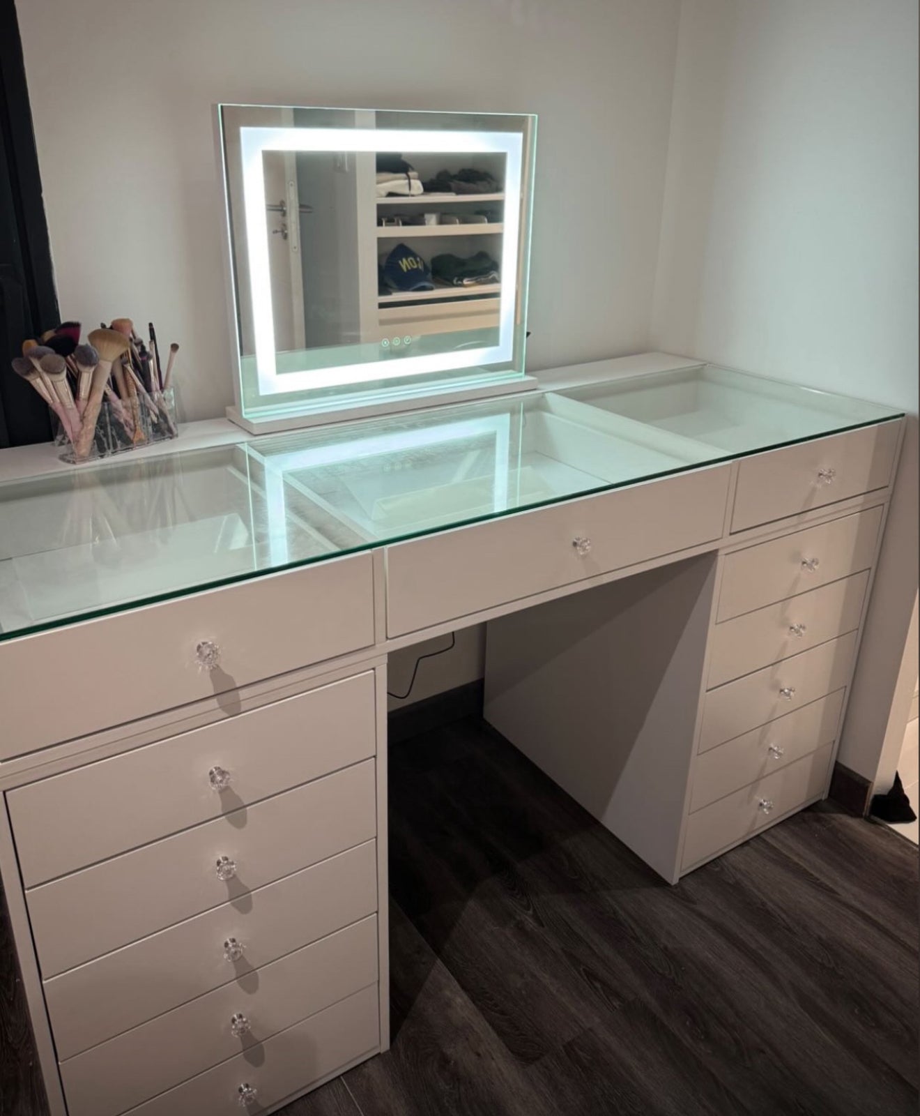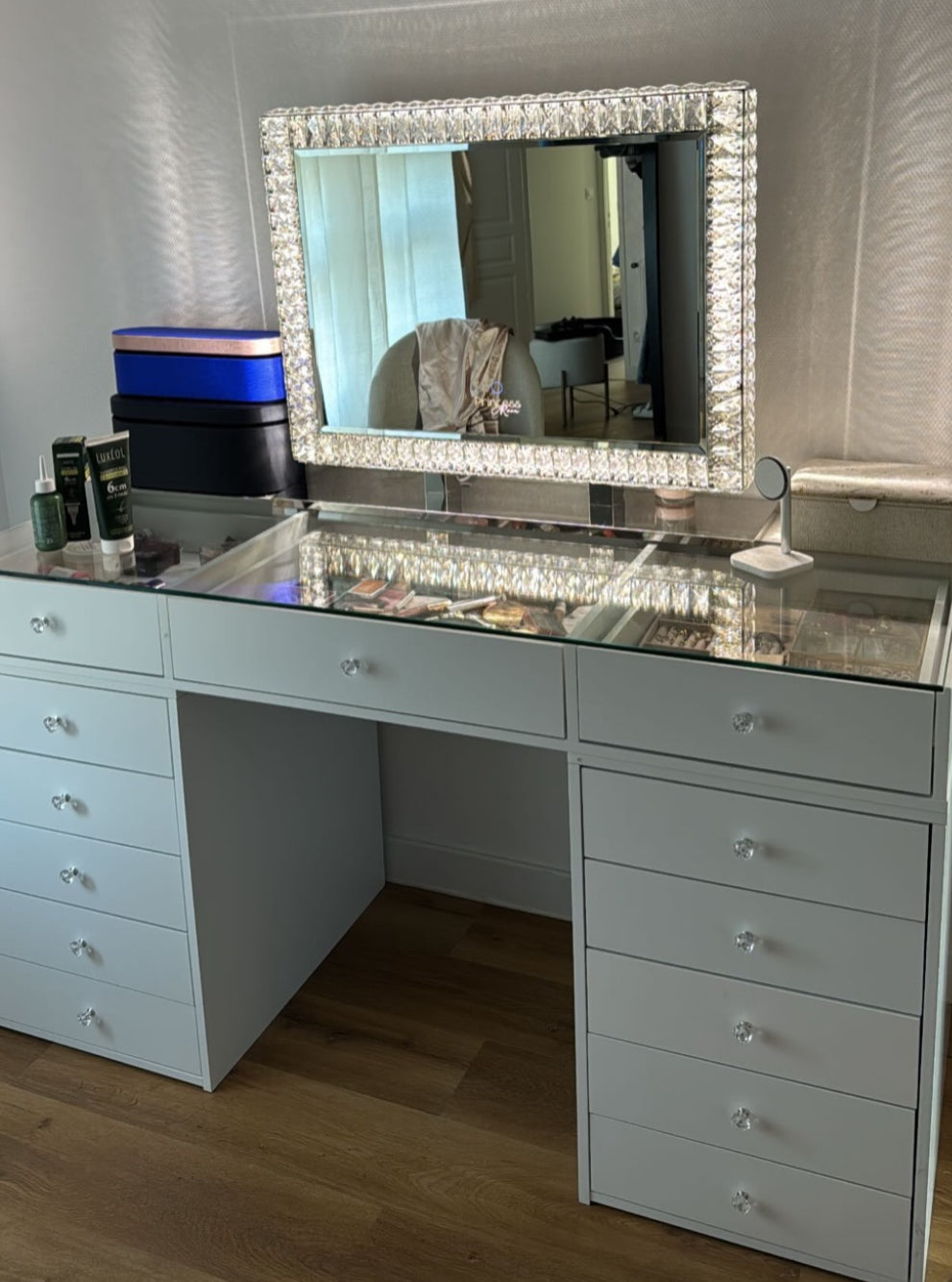 Plusieurs tiroirs profonds + options de plateaux/verre pour exposer tes favoris. Idéal pour maquillage, parfums et accessoires.