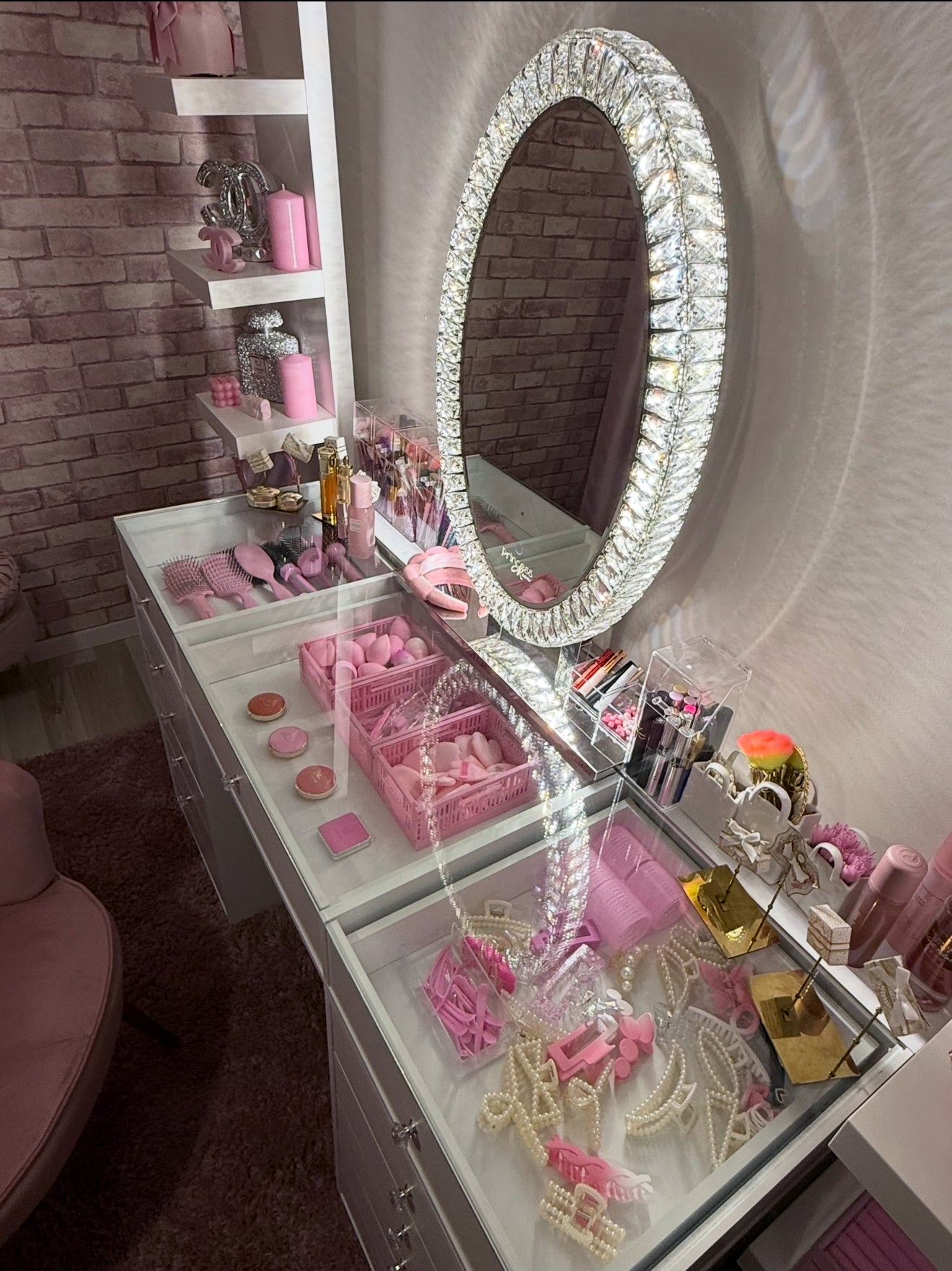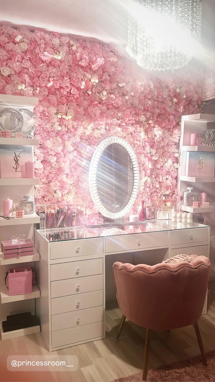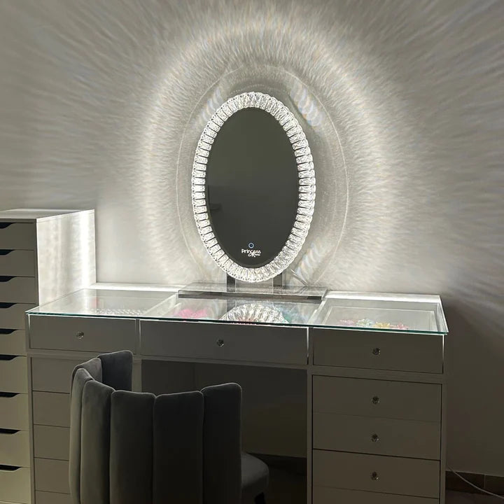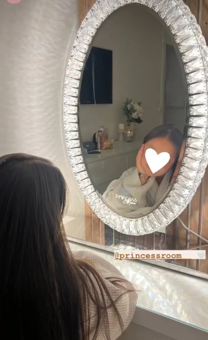 Sa forme ovale épurée, encadrée de luxueux détails en cristal, apporte une touche moderne et raffinée à toute coiffeuse ou mur. Grâce à son éclairage LED réglable, il s’adapte à ton humeur et à tes besoins — que ce soit pour un maquillage précis ou une ambiance douce et apaisante.